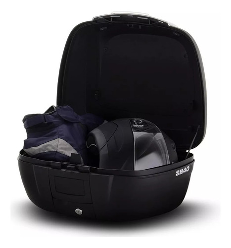GAONA MOTOS INDUMENTARIA Y ACCESORIOS ------------------------------------------ El baúl SH40 tiene capacidad para 2 cascos; 1 integral y 1 jet, incorpora el sistema retráctil «Handle Lock System», que simultáneamente bloquea el acceso al interior del baúl y lo asegura en la moto. -Con una sola mano, la maleta puede abrirse, cerrarse y desmontarse de la moto, así como transportarse con el asa retráctil integrada, todo ello sin necesidad de utilizar la llave. -Con un giro de la llave, se bloquea simultáneamente el acceso al interior de la maleta y se fija a la motocicleta. Se incluye un juego de 2 llaves. -Incorpora una junta de goma duradera para mejorar el cierre y proteger el interior contra el agua y el polvo. -Se incluye una parrilla de montaje SHAD con juego de tornillos y clips portaequipajes, aunque la mayoría de las motocicletas requieren un kit de montaje específico SHAD «Top Master» para su instalación. -Tamaño: 42,5/49,5/29,6cm. -Carga máxima recomendada: 4 kg. ---