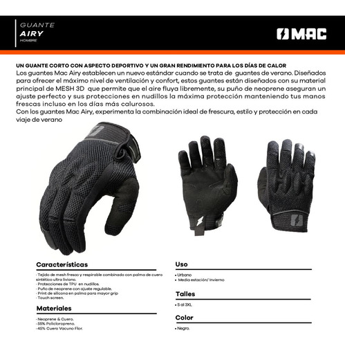 GAONA MOTOS INDUMENTARIA Y ACCESORIOS ------------------------------------------ Guantes AIRY MAC OFICIAL Hombre Negros USO URBANO MEDIA ESTACIÓN - VERANO MATERIALES MESH & NEOPRENE 91% POLIESTER- 9% POLICLOROPRENO CARACTERÍSTICAS TEJIDO DE MESH FRESCO Y RESPIRABLE COMBINADO CON UN TEJIDO LIVIANO PALMA Y LATERAL CON REFUERZOS EN ZONAS DE IMPACTO Y DESGASTE CON MICROPERFORACIONES PARA MAYOR VENTILACION. PUÑO EN TEJIDO NEOPRENE CON AJUSTE DE MUÑECA REGULABLE MEDIANTE VELCRO PROTECCIONES TPU EN NUDILLOS Y PROTECCION SOFT EN PARTE SUPERIOR DE LOS DEDOS. PRINT SILICONADO PARA GRIP TOUCH SCREEN ------------------------------------------ Contamos con local a la calle en el barrio de Flores, Capital Federal. Por la zona de Av. Gaona y Av. Nazca. Nuestros horarios de atención son de Lunes a Viernes de 10:00 a 18:00. Sábados de 10:00 a 14:00. DOMINGOS Y FERIADOS CERRADO. ------------------------------------------ FORMAS DE ENVÍO: -Mercado envíos a todo el país (excepto Tierra del Fuego)