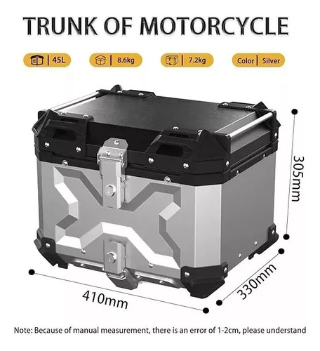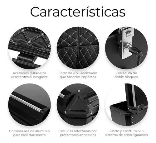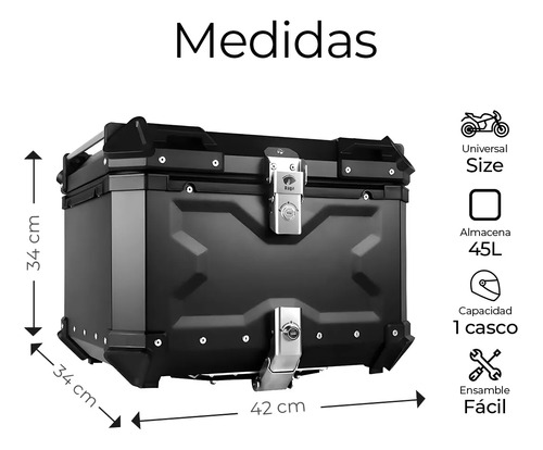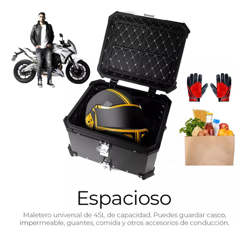 GAONA MOTOS INDUMENTARIA Y ACCESORIOS ------------------------------------------ BAUL TOP CASE 45LTS PARA UN CASCO UNIVERSAL, EXCELENTE CALIDAD. -CAPACIDAD DE 45LTS PARA GUARDAR UN CASCO ABIERTO/INTEGRAL/REBATIBLE. -MATERIAL: POLIMERO. -INTERIOR DESMONTABLE PARA PODER LAVARLO, CON DOS BOLSILLOS PARA GUARDAR DOCUMENTOS/PERTENENCIAS. -LIVIANO Y RIGIDO. -100% IMPERMEABLE, CONTIENE BURLETE DOBLE LABIO, EVITANDO EL INGRESO DE AGUA/TIERRA. -DOBLE CERRADURA PARA MAYOR SEGURIDAD. -DESMONTABLE FACILMENTE INCLUYE: -SOPORTE UNIVERSAL PARA TODA MOTO QUE CONTENGA PORTAEQUIPAJE. -TORNILLERIA PARA INSTALACION. -DOS CALCOMANIAS REFLECTIVAS. -DOS LLAVES. MEDIDAS EXTERNAS: -ALTO: 33,5CM -ANCHO: 42CM -PROFUNIDAD: 34CM MEDIDAS INTERNAS -ALTO: 32CM -ANCHO: 40CM -PROFUNDIDAD: 32CM ------------------------------------------ Contamos con local a la calle en el barrio de Flores, Capital Federal. Por la zona de Av. Gaona y Av. Nazca. Nuestros horarios de atención son de Lunes a Viernes de 10:00 a 18:00