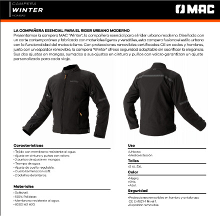 GAONA MOTOS INDUMENTARIA Y ACCESORIOS ------------------------------------------ CAMPERA URBAN HOMBRE, LA COMPAÑERA ESENCIAL PARA EL RIDER URBANO MODERNO. Presentamos la campera MAC "Urban", la compañera esencial para el rider urbano moderno. Diseñada con un corte contemporáneo y fabricada con materiales ligeros y versátiles, esta campera fusiona el estilo urbano con la funcionalidad del motociclismo. Con protecciones removibles certificadas CE en codos y hombros, junto con un espaldar removible, la campera "Urban" ofrece seguridad adaptable sin sacrificar la elegancia. Sus dos ajustes en mangas, sumados a sus ajustes en cintura y puños con velcro garantizan un ajuste personalizado para cada viaje. Características ·Tejido con membrana resistente al agua. ·Ajuste en cintura y puños con velcro. ·2 puntos de ajuste en mangas. ·Trampa de agua. ·Ajuste de cuello regulable. ·Cuello terminacion soft. ·2 bolsillos delanteros Materiales ·Softshell. ·100% Poliéster. ·Membrana resistente al